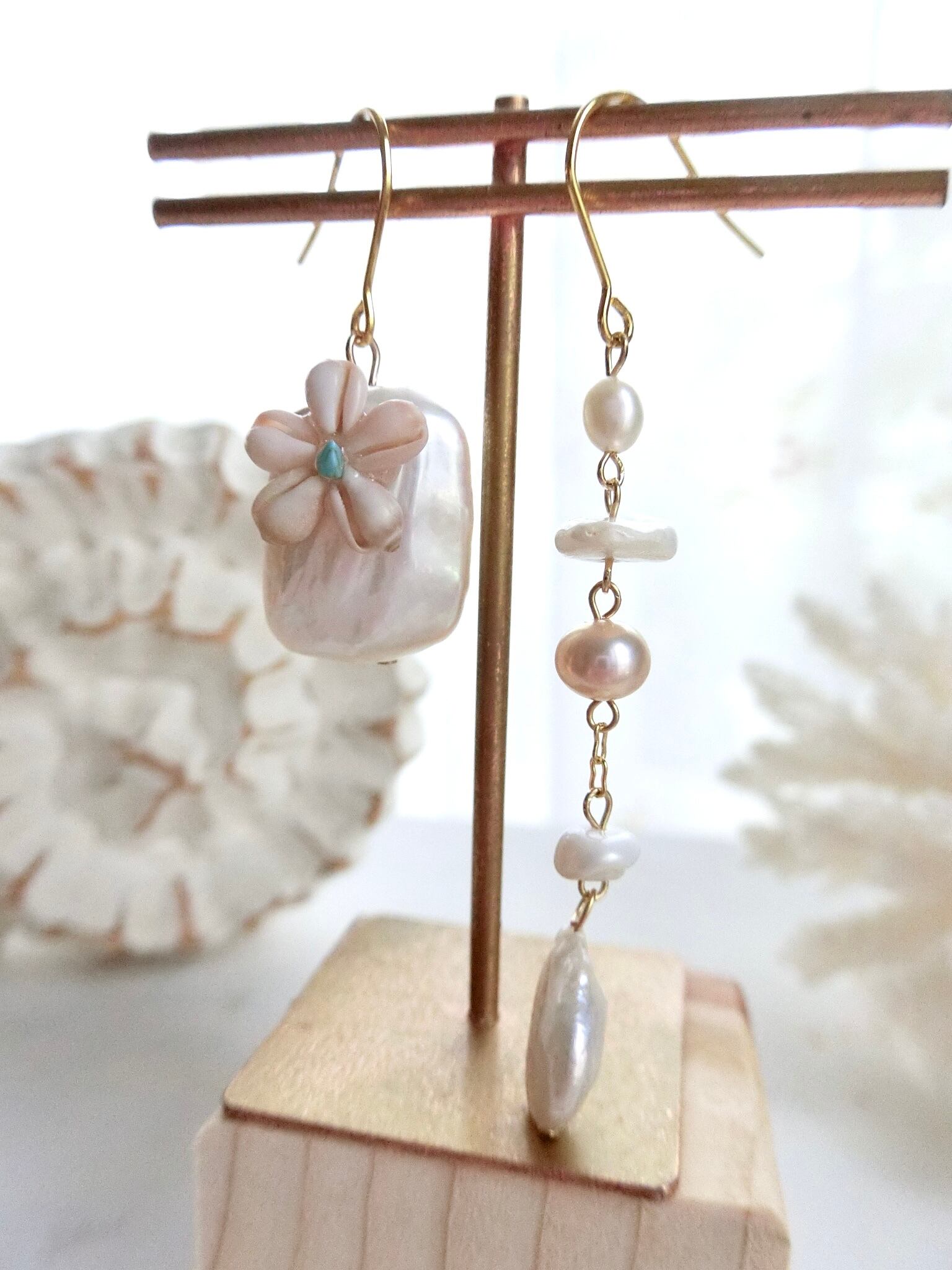 アシンメトリーに片耳は淡水パールを贅沢に使ったロングピアスに仕上げました☆
