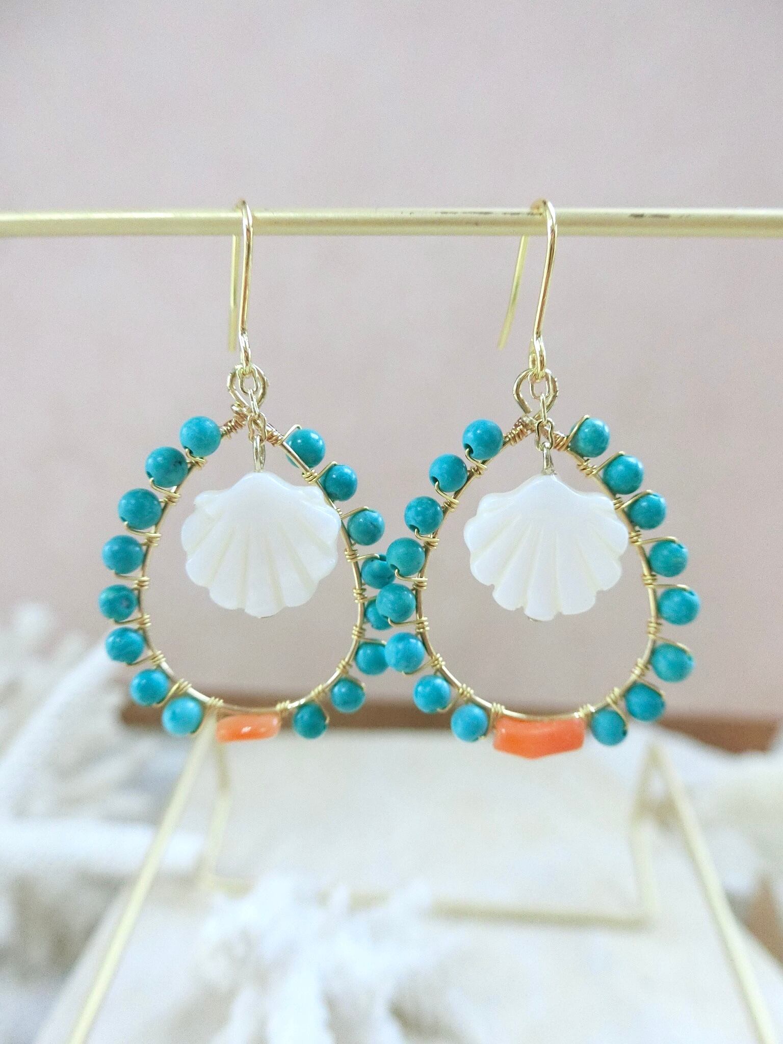 ドロップをぐるっと一周ターコイズ と珊瑚で囲った中に、シェル素材のシェルがポイントに揺れるピアスです⭐︎