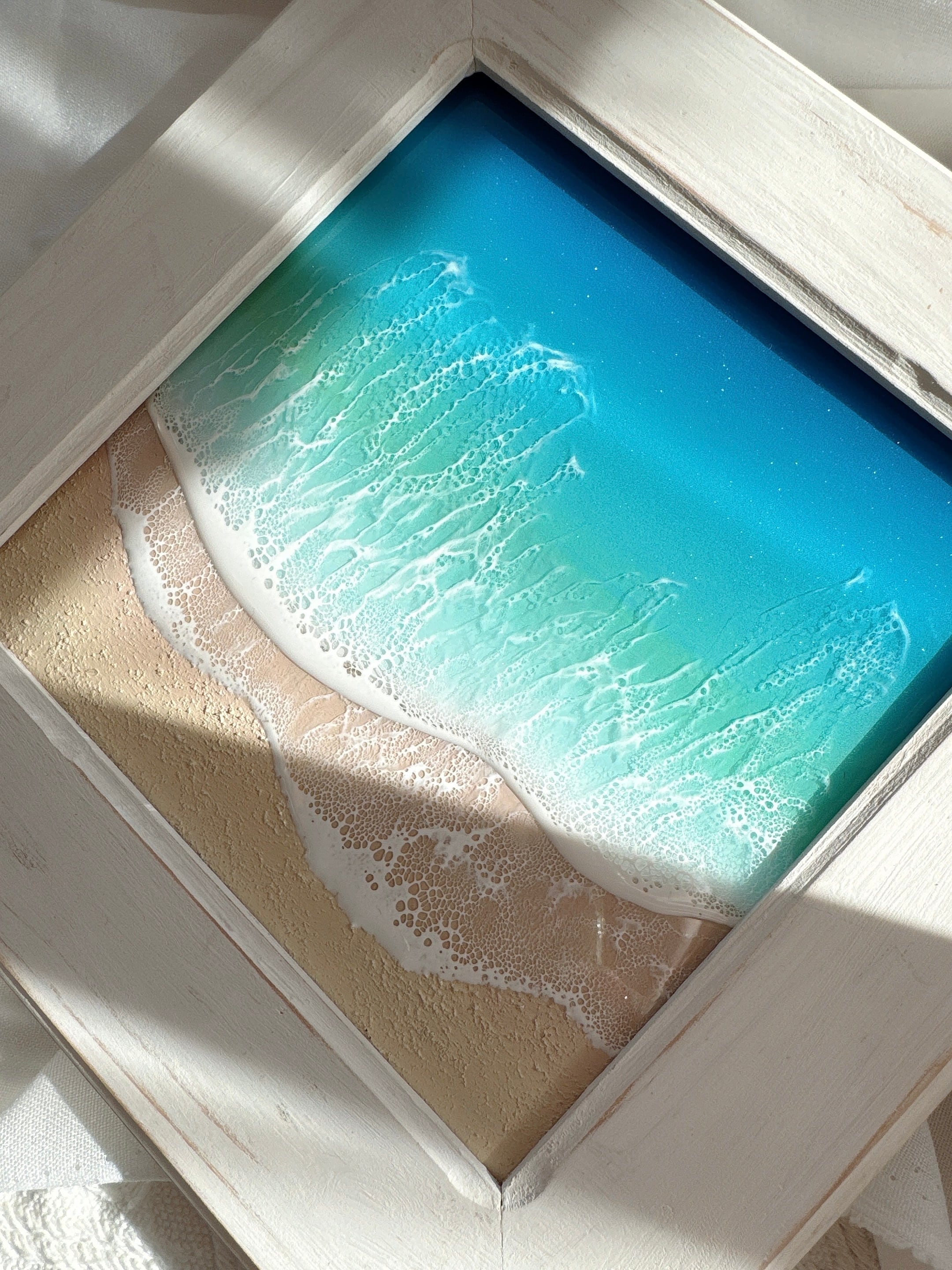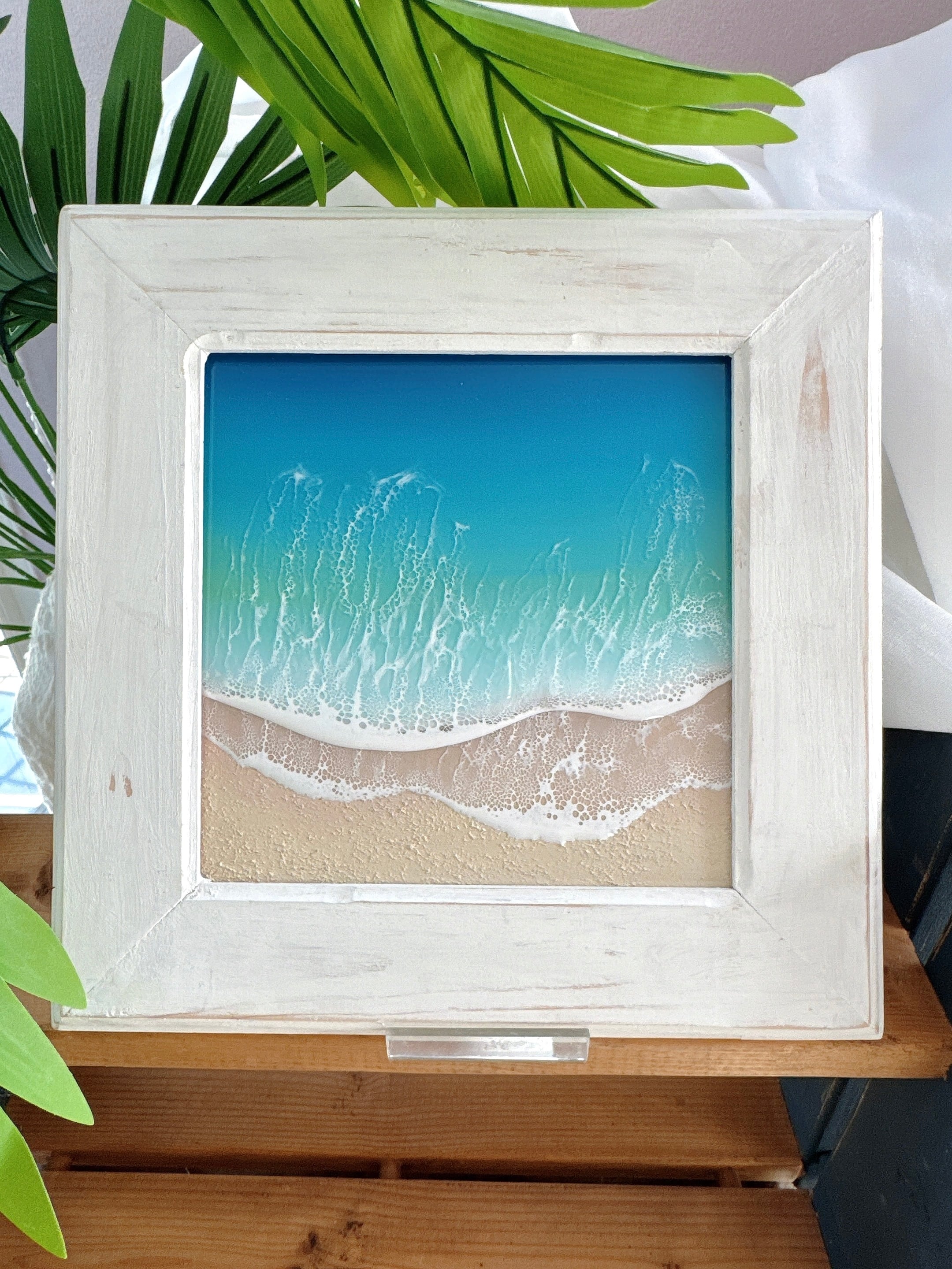 アンティークホワイトのウッドフレームと海レジンアートパネルをセットにしたお得な販売です。