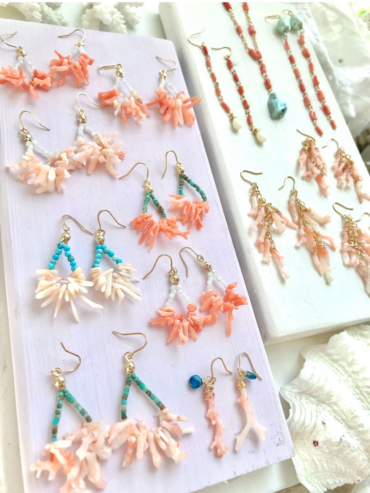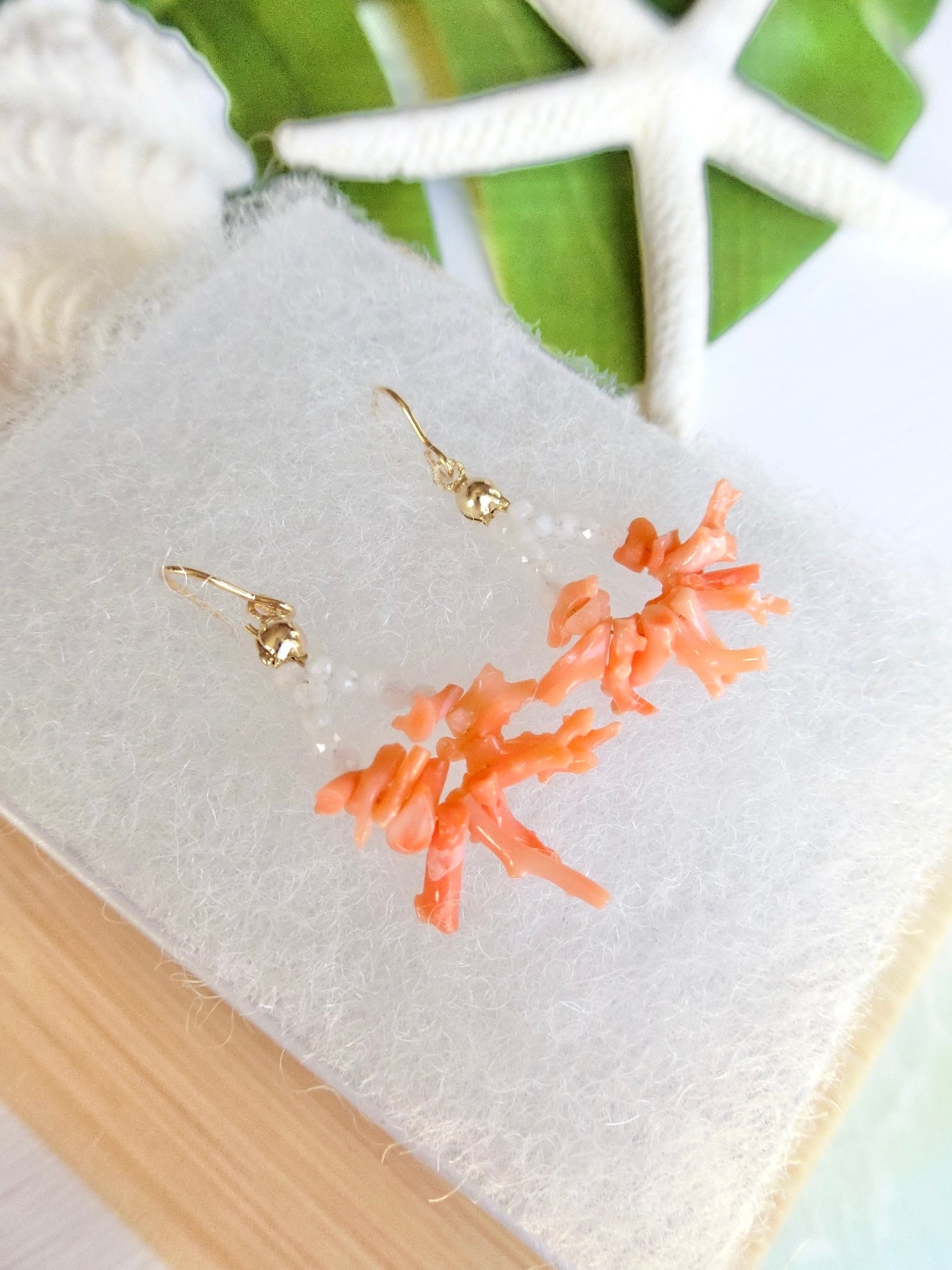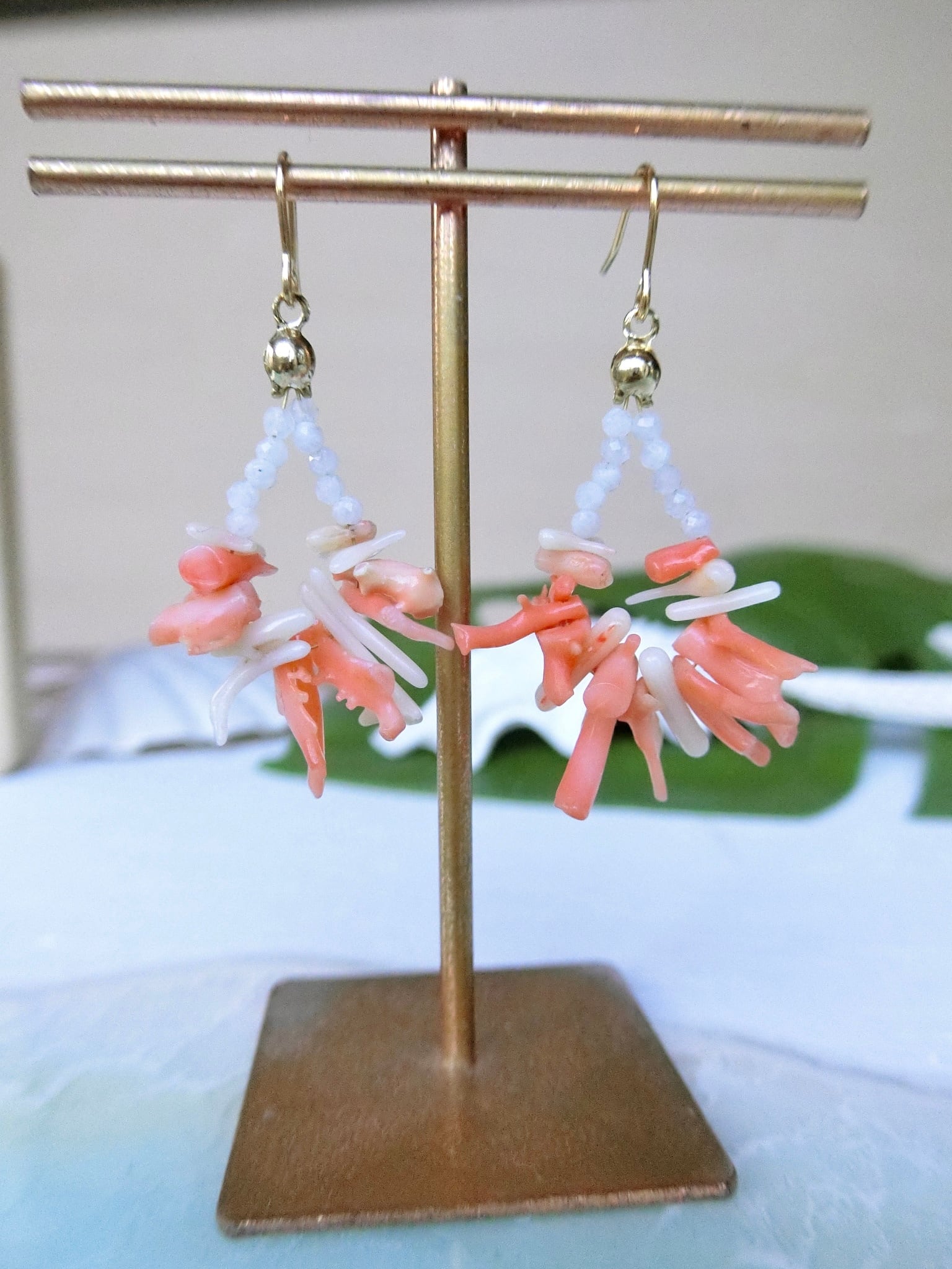 桃色枝珊瑚と極小の天然石を贅沢に使用したピアスです。