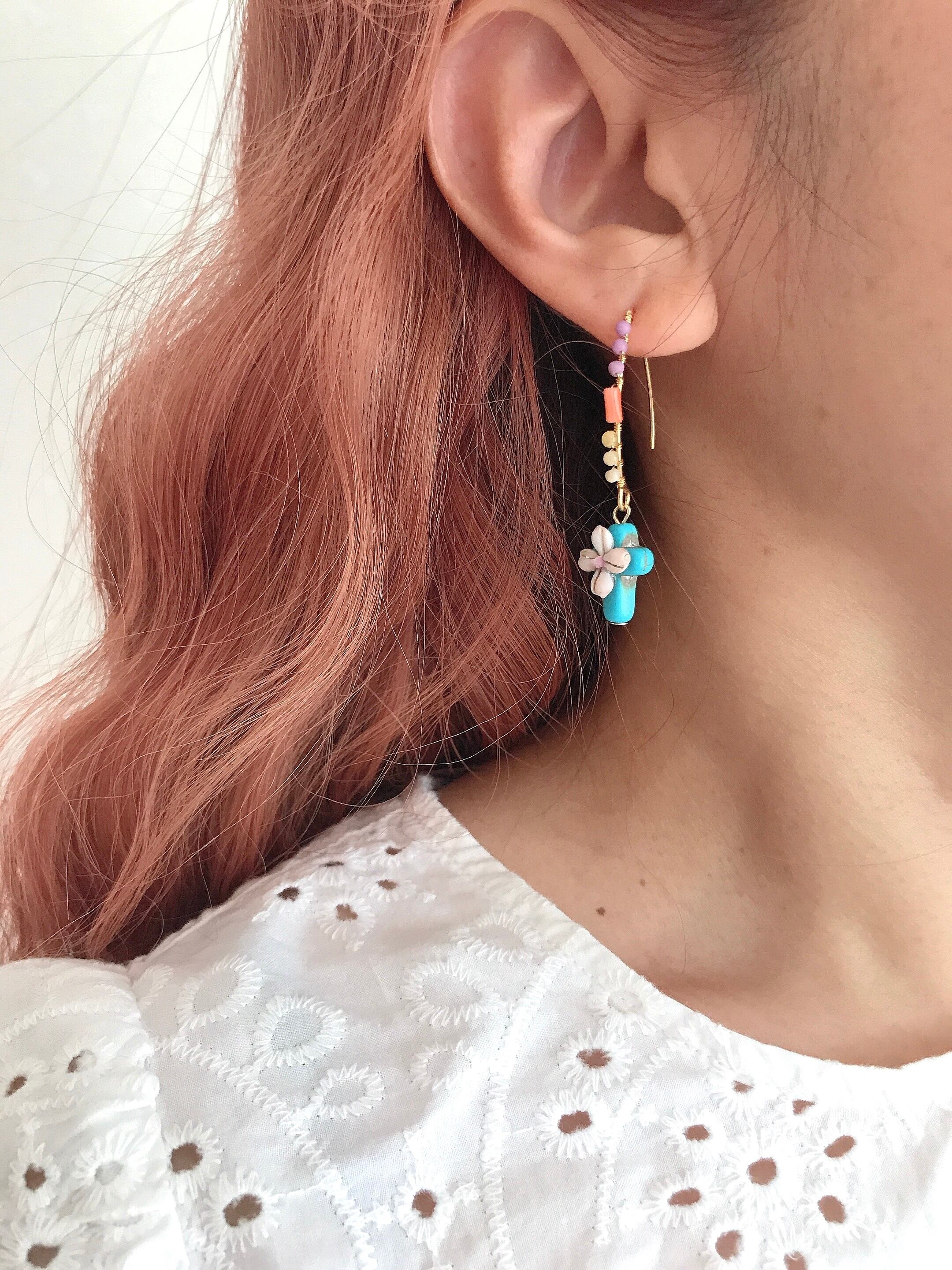 ターコイズクロスの上に極小のシェルをプラスした夏らしいチャームと、極小のストーンの組み合わせがたまらない⭐︎