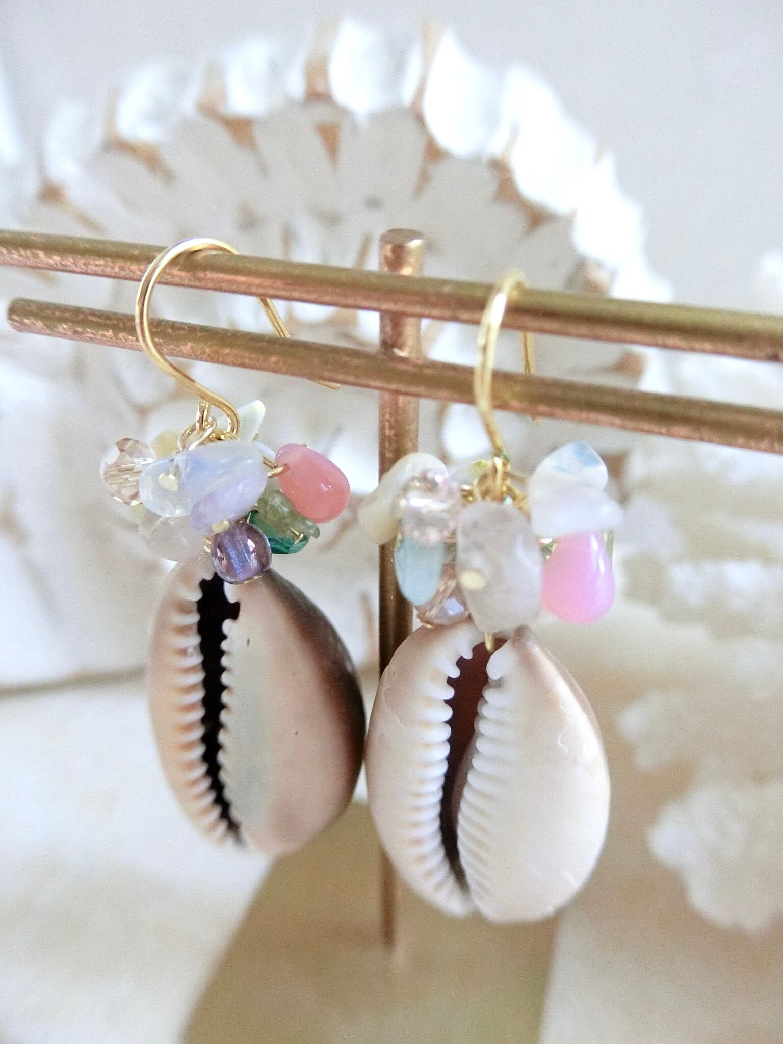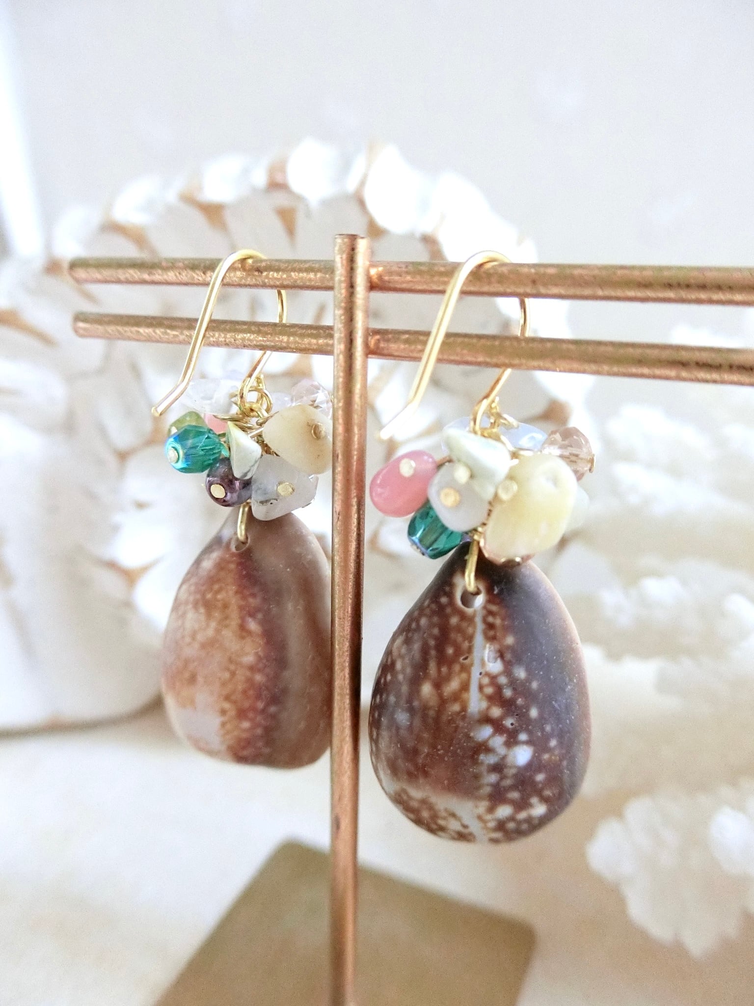 ちょっと一味違ったほんのりブラウンカラーがとても珍しい、ハナマルユキダカラを使用したジャラジャラピアスです⭐︎
