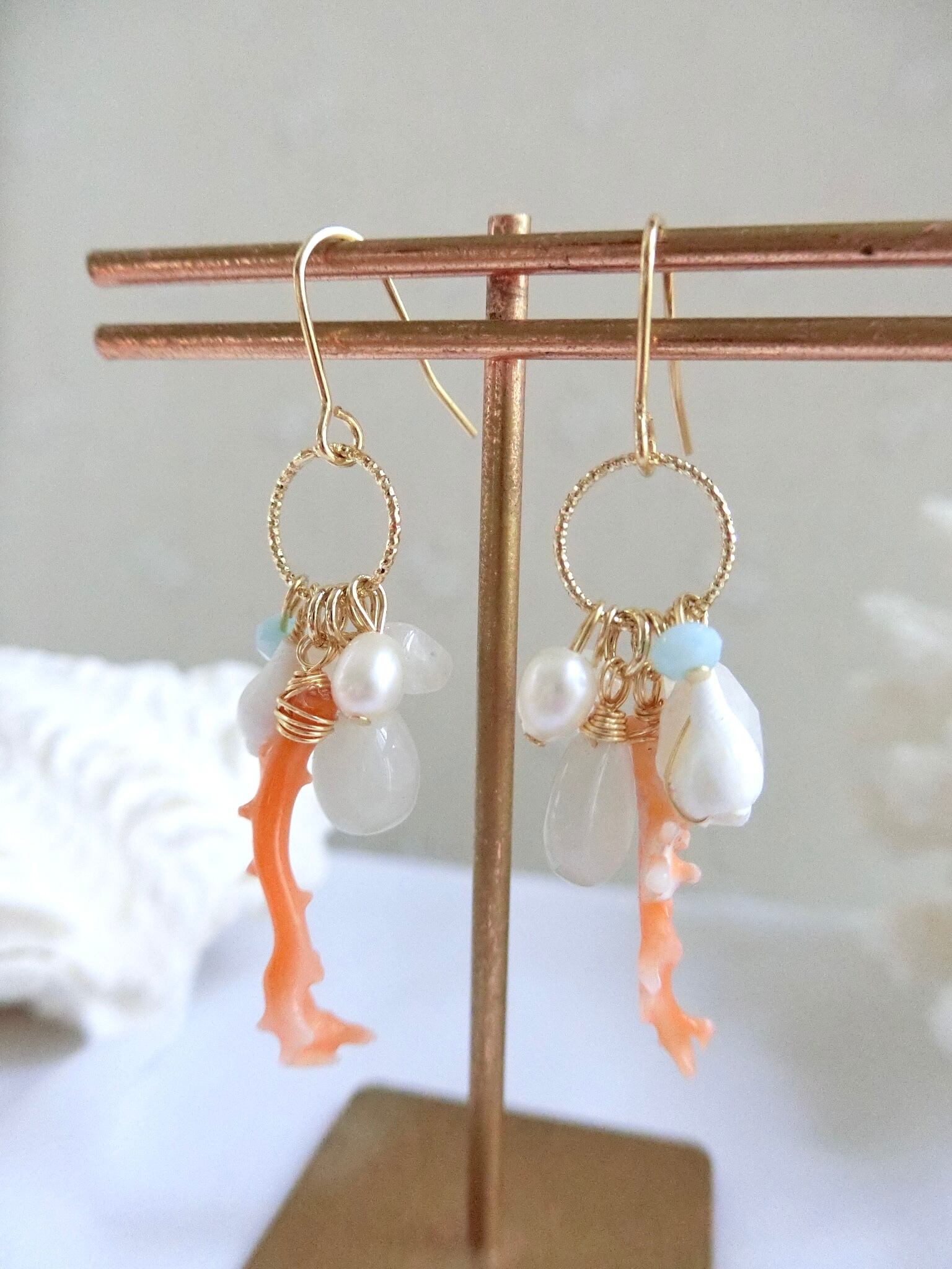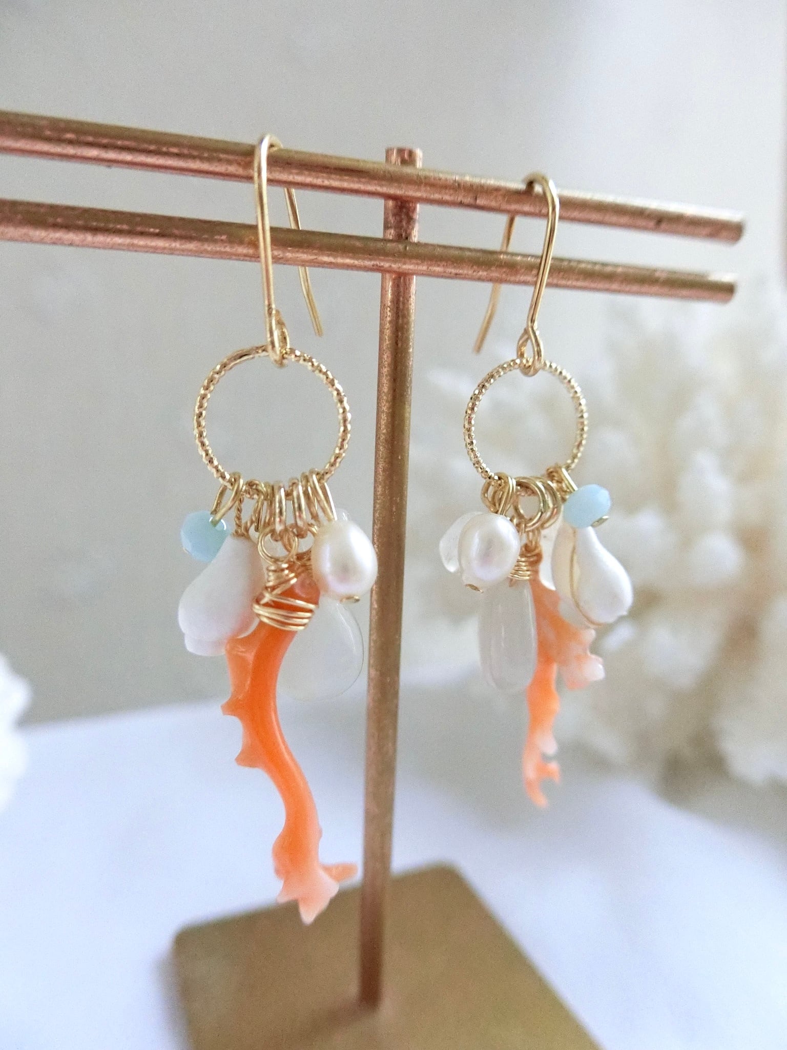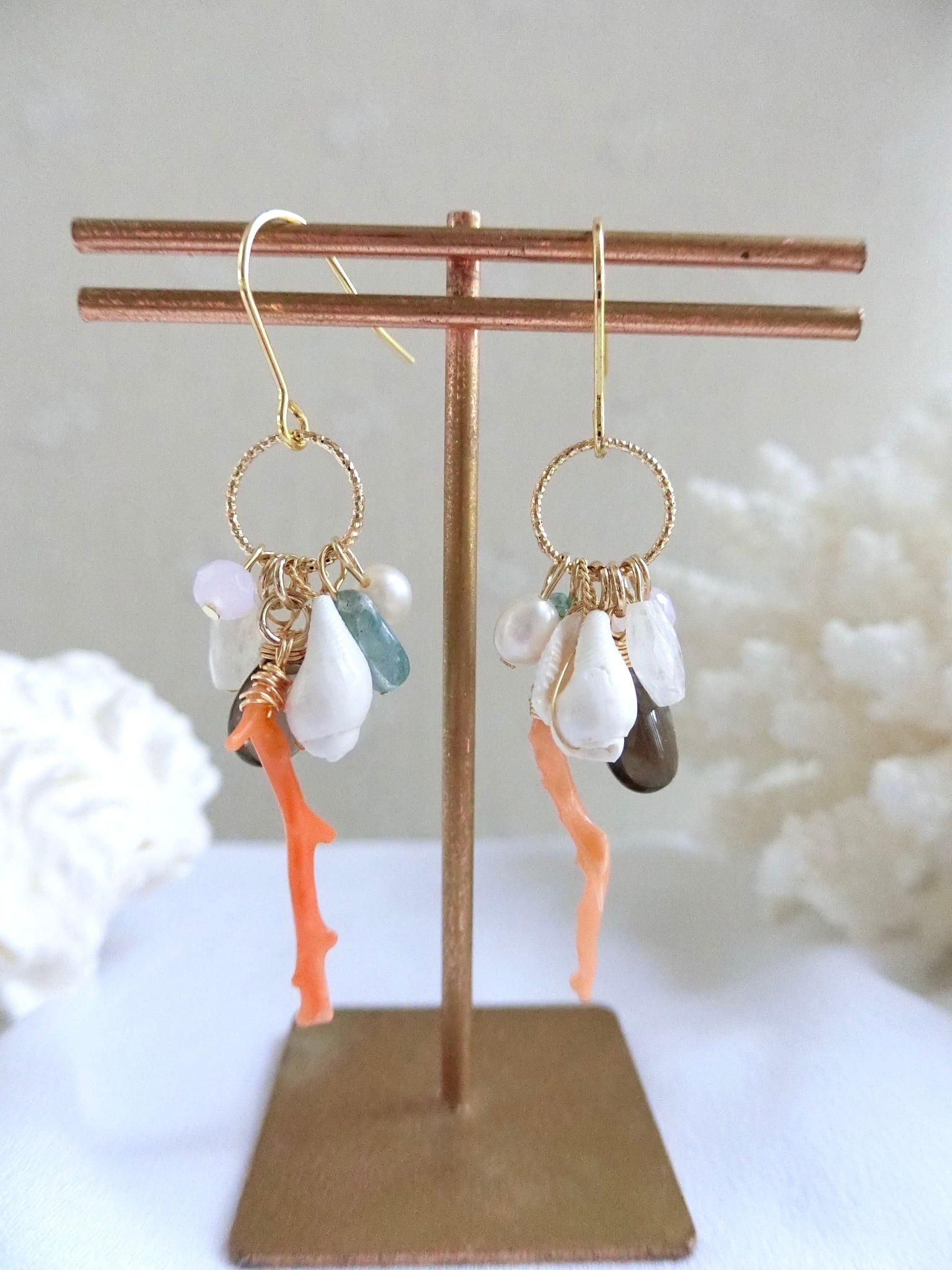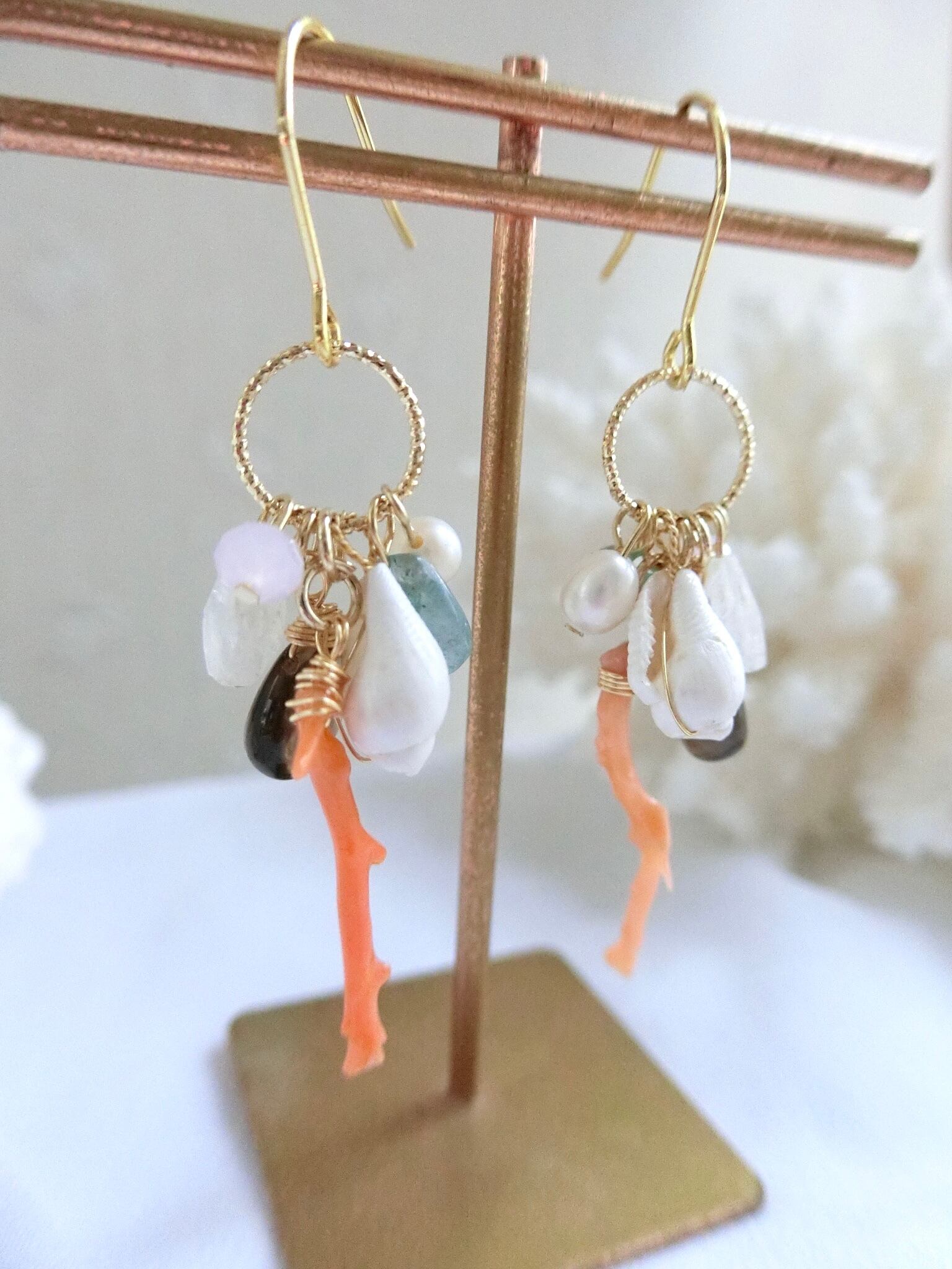 小さめサイズのフープに珊瑚や天然石、シェルなどを贅沢に詰め込んだピアスです。