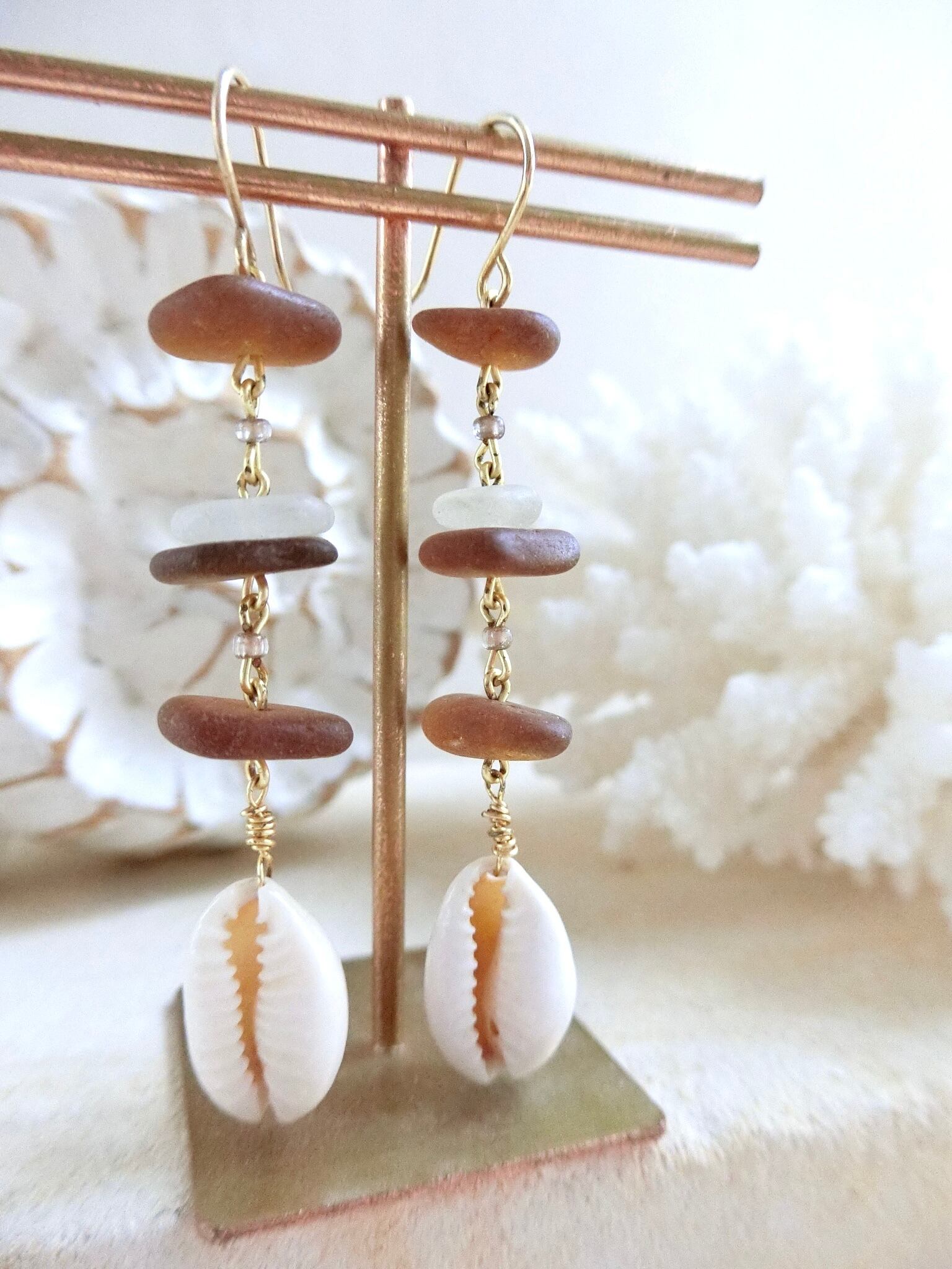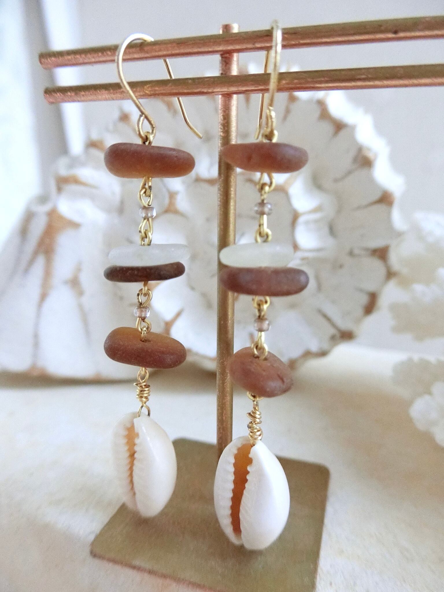 ブラウンカラーのシーグラスをベースに、ホワイトカラー、ポイントにタカラガイをぶら下げたロングピアスです⭐︎