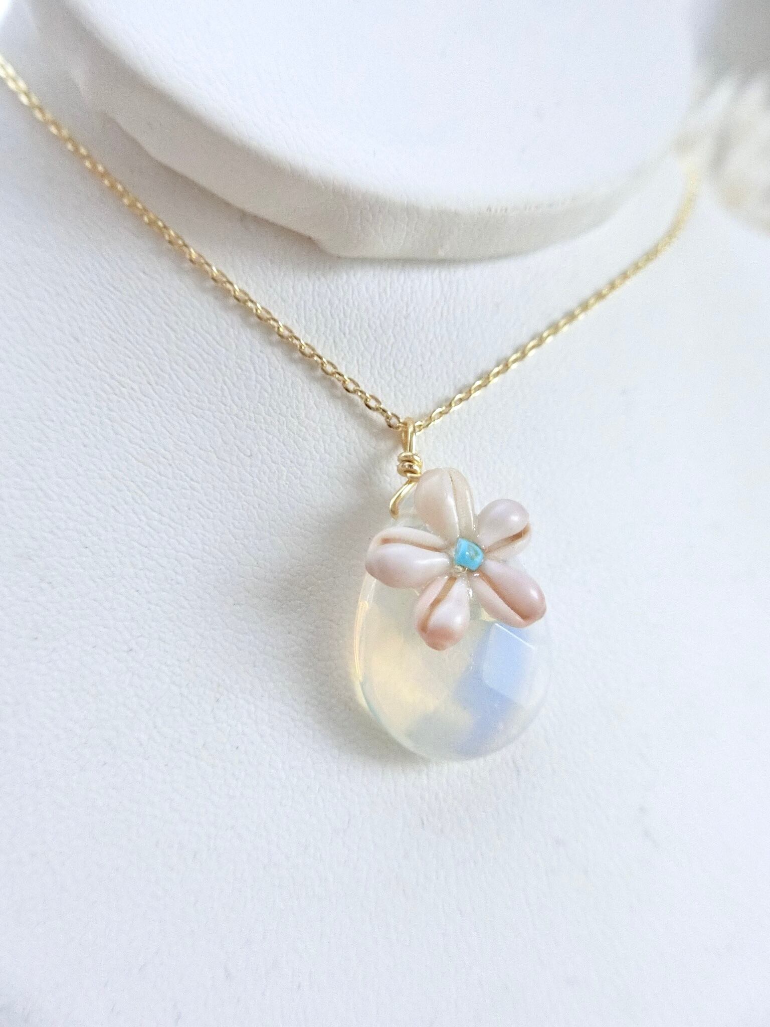 ドロップ型の合成オパールにシェルフラワーをプラスした可愛いペンダントです。