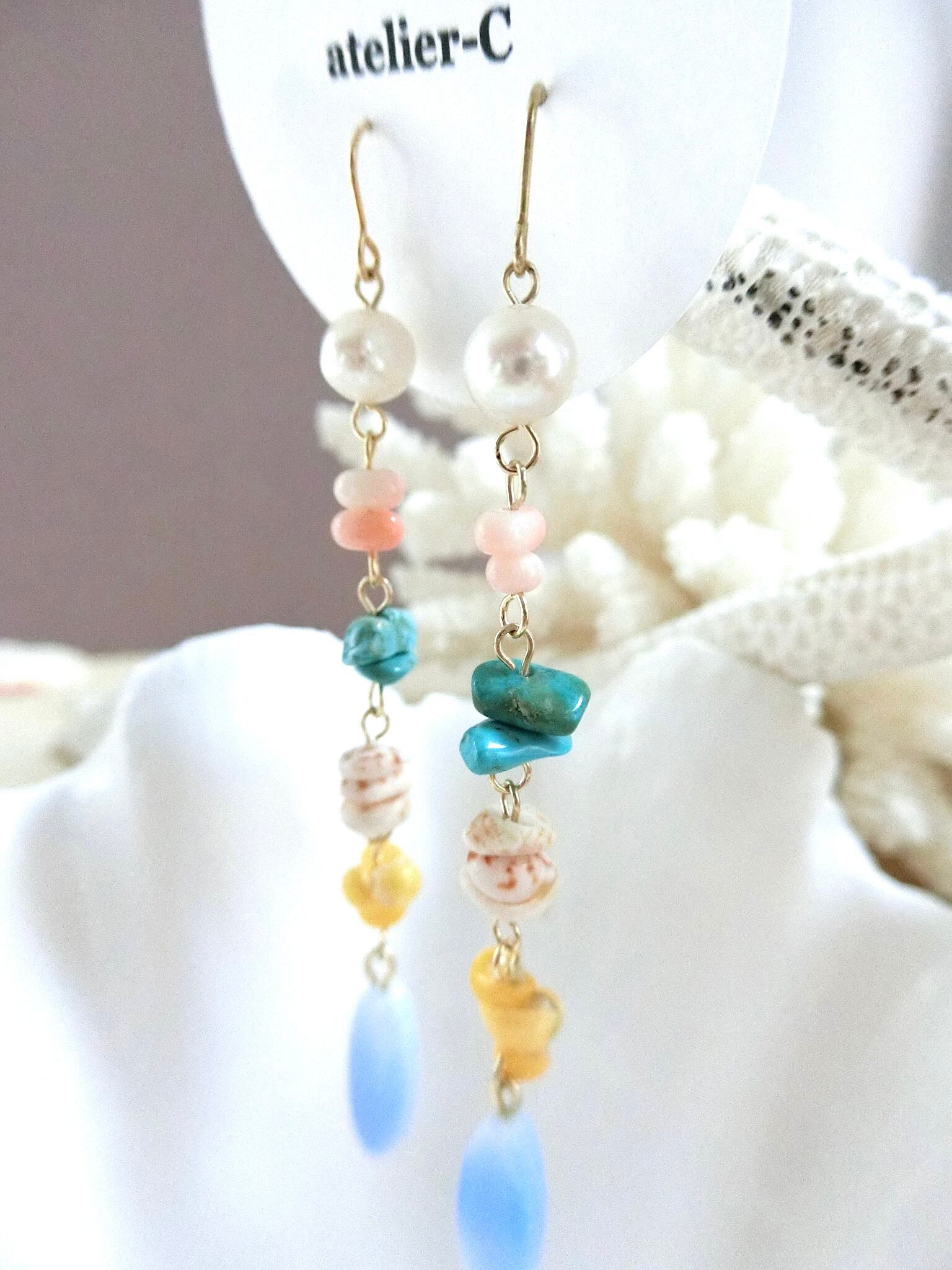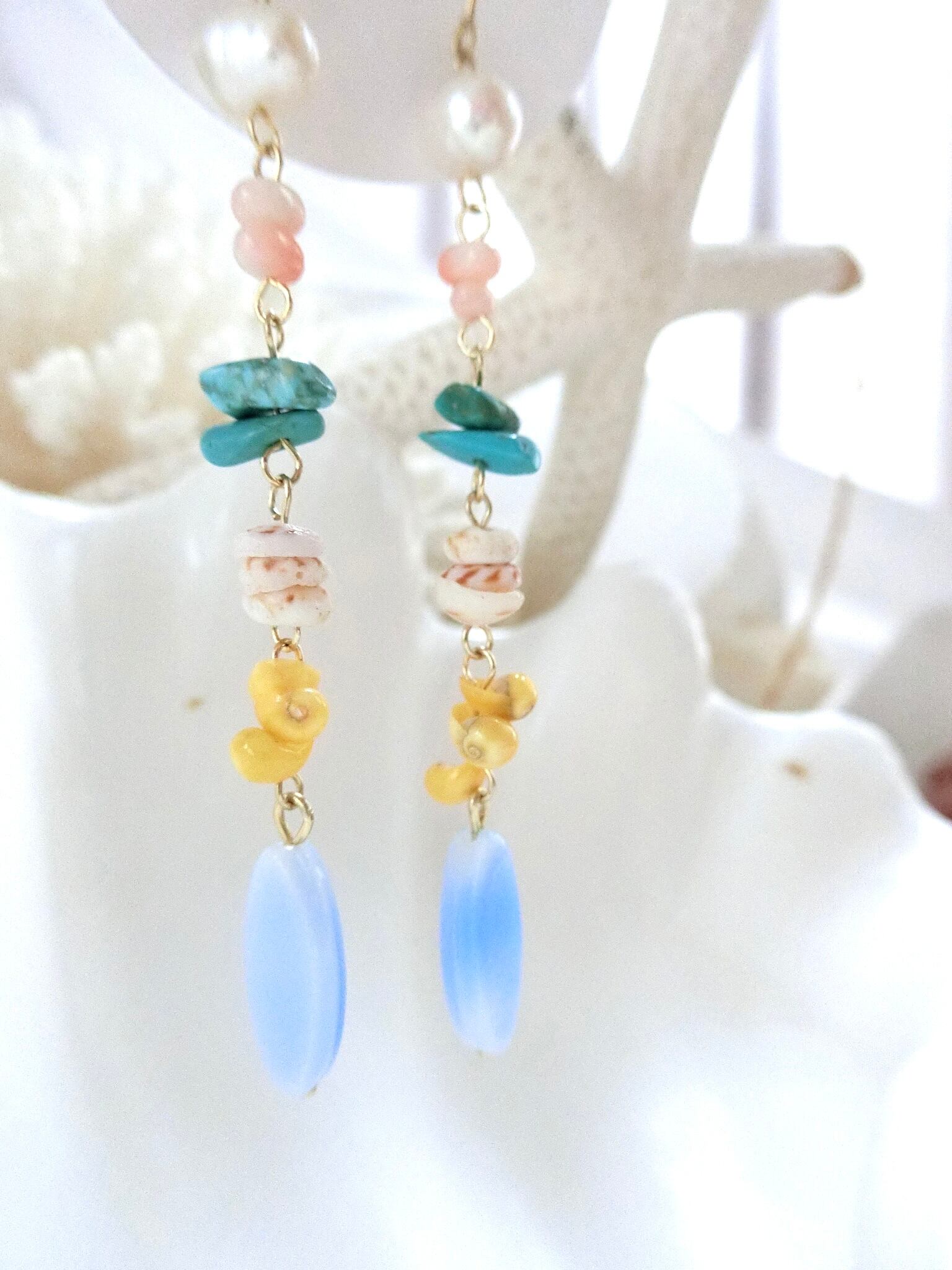 シェル、パール、ターコイズ、珊瑚と、贅沢過ぎる組み合わせのロングピアスです⭐︎