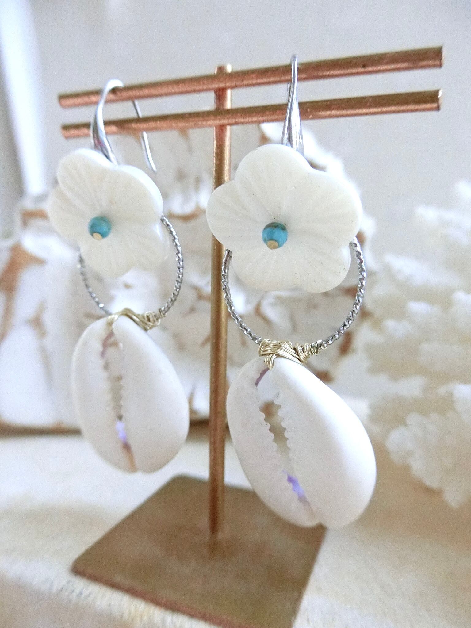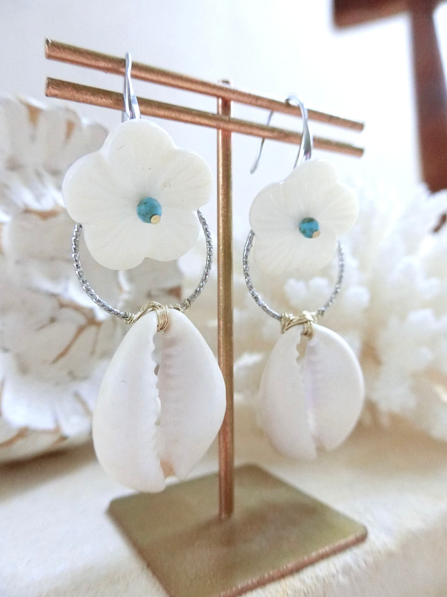 シェル素材のフラワーパーツに極小のターコイズ、