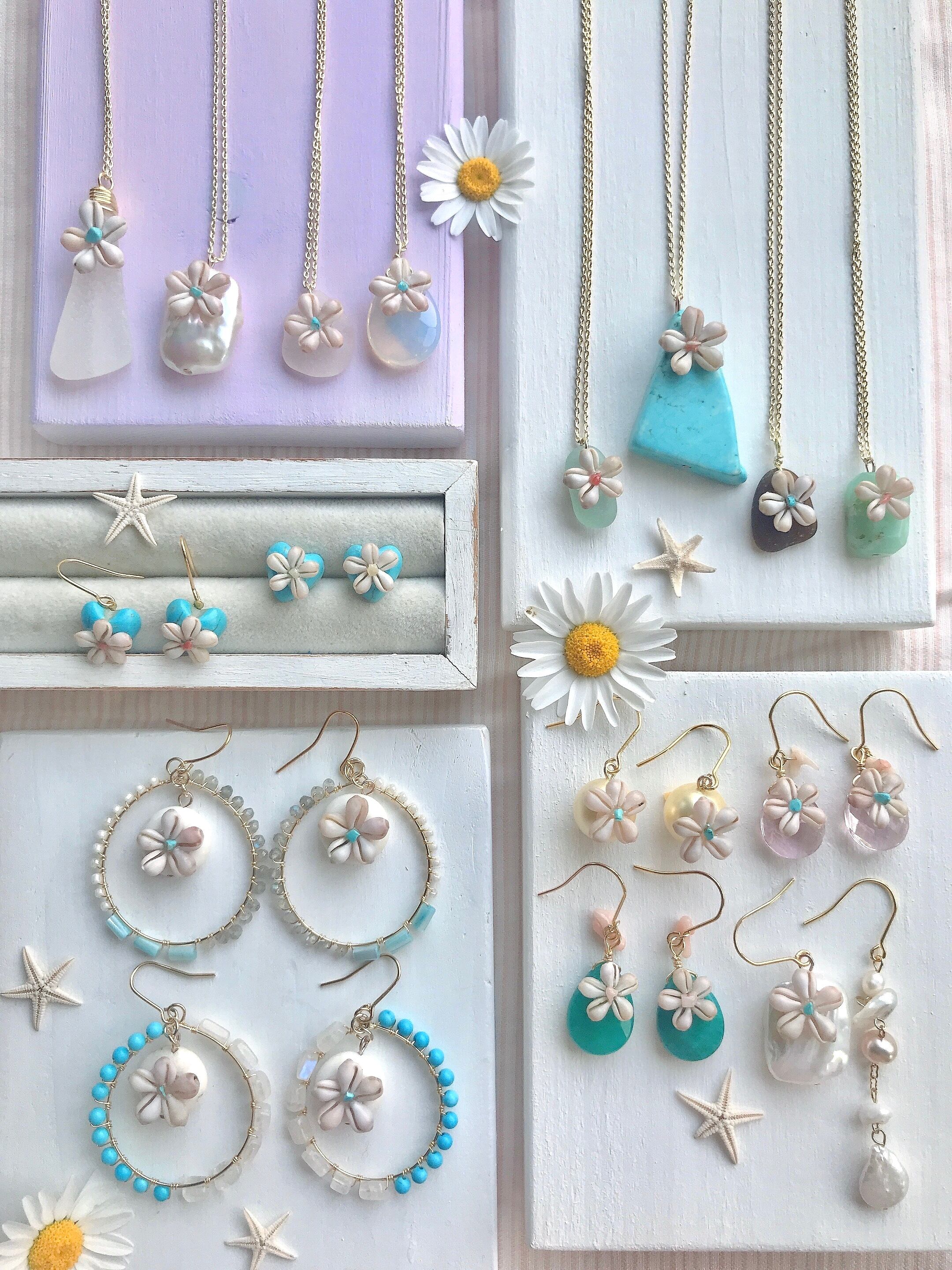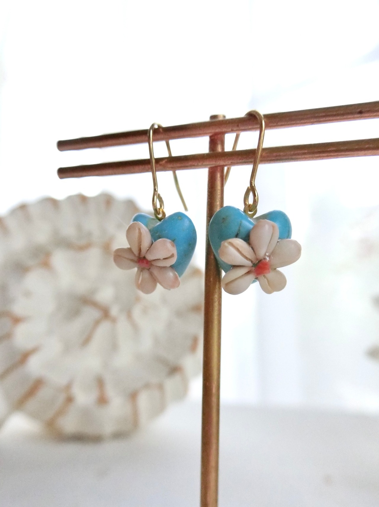 ハートターコイズのシェルフラワーピアス ぶら下がり